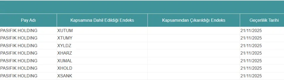 PASIFIK HOLDING payları, 21/11/2025 tarihinden itibaren Borsa İstanbul Yıldız Pazar'da işlem görmeye başlayacağından, söz konusu tarihten itibaren BIST Tüm, BIST Tüm-100, BIST Yıldız, BIST Halka Arz, BIST Mali, BIST Holding ve Yatırım ve BIST Ankara endeksleri kapsamına dahil edilecek olup, endekslerin hesaplanmasında şirketin paylarının sayısı 20.000.000.000, fiili dolaşımdaki pay oranı ise %20 olarak dikkate alınacaktır.