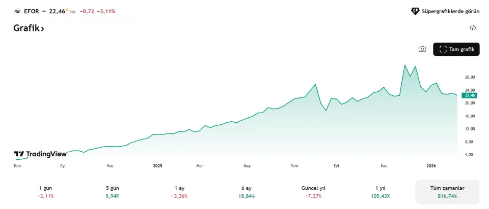 Temmuz 2024’te halka arz edilen Efor Çay, borsaya açıldığı tarihten bu yana yatırımcısına %800’ü aşan getiri sunarak dikkat çekici bir performans ortaya koydu. Bu yükselişle birlikte hisse, yatırımcısının parasını neredeyse 10 katına kadar çıkarmış oldu. Uzun süreli yükseliş trendi, şirketi son dönemin en çok konuşulan halka arzlarından biri haline getirdi.