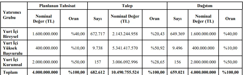 Halka arzda; Yurt İçi Bireysel Yatırımcılara nihai tahsisat tutarının yaklaşık 1,34 katı, Yurt İçi Yüksek Başvurulu Yatırımcılara nihai tahsisat tutarının yaklaşık 13,35 katı, Yurt İçi Kurumsal Yatırımcılara ise nihai tahsisat tutarının yaklaşık 1,50 katı oranında talep gelmiştir.