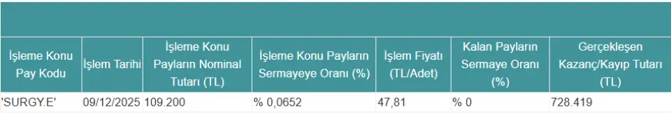 Şirketimizin 27.11.2024 tarihli Yönetim Kurulu Kararı ve 18.12.2024 tarihli Olağanüstü Genel Kurul Toplantısı kararına istinaden kabul edilen Pay Geri Alım Programı çerçevesinde edinilen 109.200 adet ‘SURGY.E' paylarının satış işlemi 09.12.2025 tarihinde ortalama 47,81 TL fiyat ile Borsa İstanbul Pay Piyasasında gerçekleşmiş olup; bu işlemle birlikte şirketimiz tarafından geri alınan payların şirket sermayesindeki oranı sıfırlanmıştır. İşlem detayları aşağıda yer alan tabloda bilgilerinize sunulmuştur.