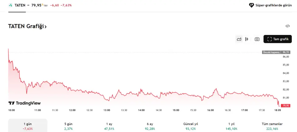Ama bu rüzgar çok uzun esmedi. Şirketin hissesi bir süre sonra duruldu, grafikteki o sert çıkışlar yerini yatay bir seyre bıraktı. Artık hisse uzun zamandır sakin ilerliyo diyebiliriz. Yine de yıl bazında bakıldığında, Tatlıpınar Enerji’nin %145 oranında değer kazandığını görmek mümkün. Bu da azımsanacak bir rakam değil. Ancak son iş gününde tablo biraz tersine döndü, hisse %7 değer kaybederek 79,96 TL seviyesine kadar indi.