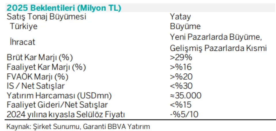 Faaliyet giderleri / net satışlar oranın %15’in altında 2024 yılına göre ortalama selülöz fiyatında ABD Doları bazında %5 ile %10 oranında düşüş beklenmektedir. 1Y25 dönemde selülöz fiyatlarında %10’un üzerinde bir düşüş takip edilirken tüm yılda bir toparlanma beklentisinin bulunduğu paylaşılmıştır. Satış tonajında da gümrük tarifleri sonrasında tüm dünya pazarlarında etkili olan daralma ve iç piyasadaki normalleşme sonrasında toparlanma olması beklenmektedir.