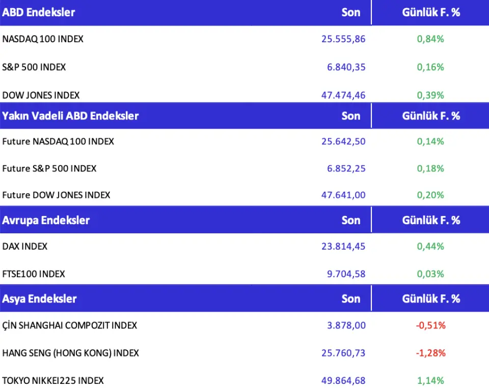 ABD borsaları, Bitcoin’in 90 bin doların üzerine çıkması ve yaklaşan ekonomik veriler öncesinde temkinli bir yükseliş kaydetti. S&P 500 %0,25, Nasdaq 100 %0,84 değer kazanırken, Apple hisseleri teknoloji grubunda öne çıktı. Yatırımcıların odağında Kasım ADP özel sektör istihdamı, Eylül sanayi üretimi ve Cuma yayımlanacak kritik çekirdek PCE verisi bulunuyor. Vadeli endeksler hafif artıda işlem görürken, ABD 10 yıllık tahvil getirisi yatay, dolar endeksi ise hafif geriledi. Öne çıkan şirket haberleri arasında Tesla’nin Çin satışlarındaki artış, Amazon’un yapay zekâ çip yatırımları, Marvell Technology’nin AI odaklı satın alımları ve Medline’ın halka arz hazırlıkları yer alıyor.