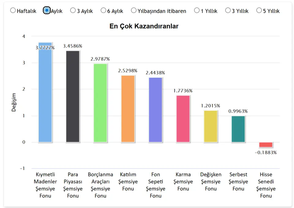 Kıymetli Madenler Şemsiye Fonu yatırımcılarına 1 ayda toplamda %3,7727 oranında kazandırdı. Listenin ikinci sırasında Para Piyasası Şemsiye Fonu yer aldı. Bu şemsiye fon ise yatırımcılarına %3,4586 oranında kazandırdı. Listede üçüncü sırada Borçlanma Araçları Şemsiye Fonu yer aldı. Bu şemsiye fon ise yatırımcılarına %2,9787 oranında kazandırdı. İlk beş kazandıran fonlarda dördüncü sırada %2,2,5298 ile Katılım Şemsiye Fonu yer alıyor.