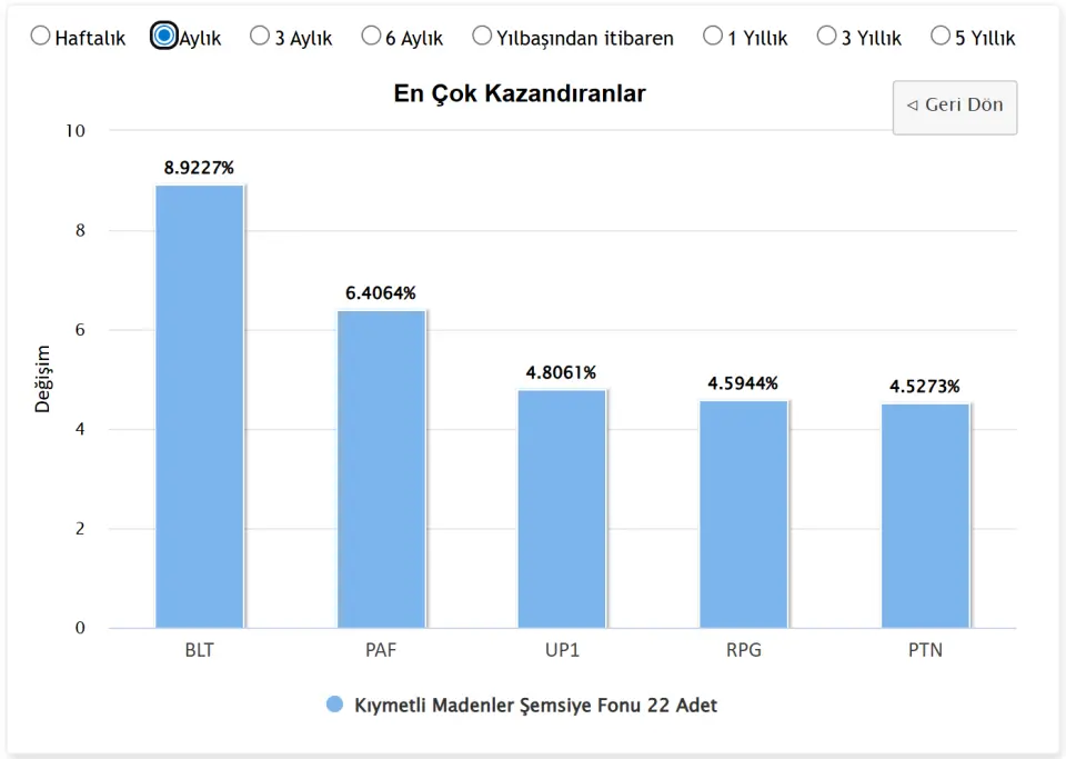 Kıymetli madenler şemsiye fonu detaylarına bakacak olursak, en çok kazandıran fon BLT kodlu fon olmuş. Bu fon 1 ayda yatırımcılarına %8,9227 kazandırmış. İkinci en çok kazandıran Kıyametli Madenler Fonu ise &6,4064 ile PAF olmuş. Bunun yanında devam eden sırada %4,8061 ile UP1, %4,5944 ile RPG yer alıyor.