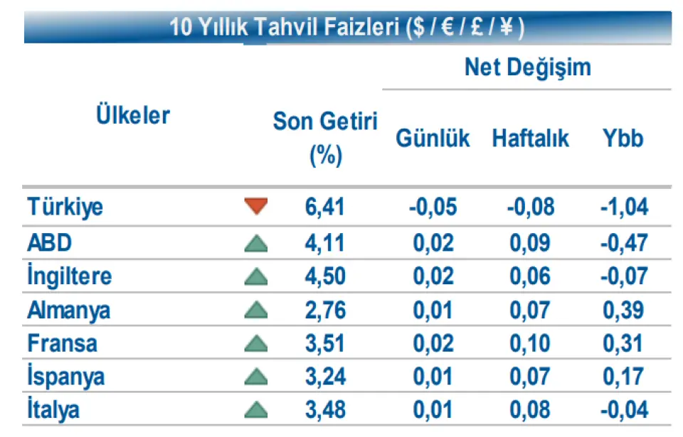 Türkiye’nin 5 yıllık Dolar cinsi CDS risk primi 2018 yılından beri en düşük seviye olan 232 bp seviyesinden işlem görürken, Ocak 2035 vadeli 10 yıllık Eurobond faizi 5 bp azalışla %6,41 seviyesinden işlem gördü.