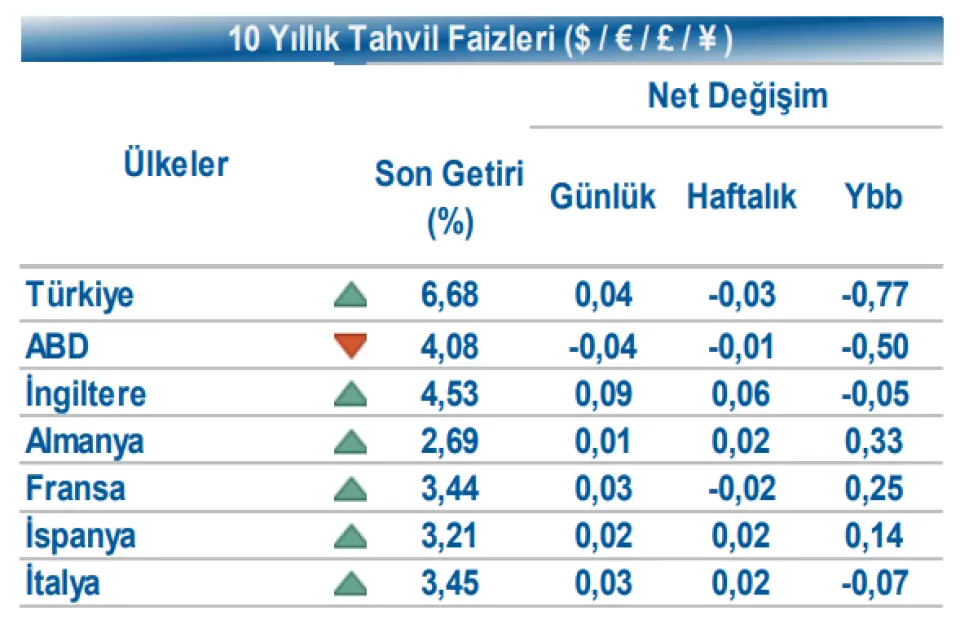 Küresel piyasalarda, Euro Bölgesi 3.çeyrekte beklentiler dahilinde %0,2 büyüdü. Veri gündeminin zayıf olduğu günde tahvil piyasalarında sınırlı alıcılı seyir izlendi. Gün içinde ABD 10 yıllık gösterge tahvil faizi 4 bp azalışla %4,08, Almanya 10 yıllık gösterge tahvil faizi 2,69 seviyesinde işlem gördü.