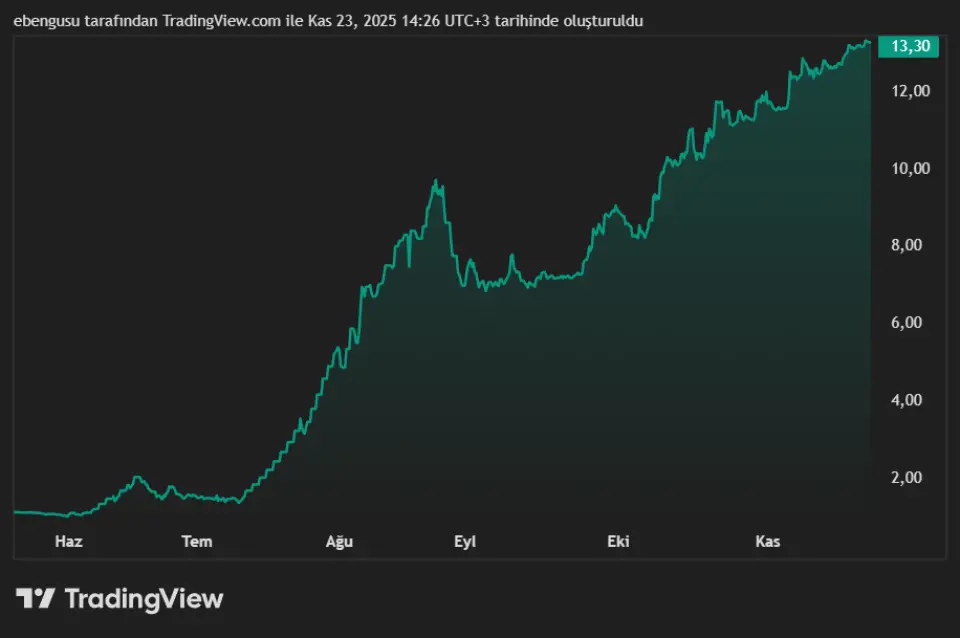 3 Haziran 2025 tarihinde 1,04 TL olan PEKGY, 21 Kasım 2025 tarihinde 13,30 TL ile kapanış yaptı. Son 6 ayda %1.100, son 4 ayda ise hissenin fiyatı %323 yükseldi.