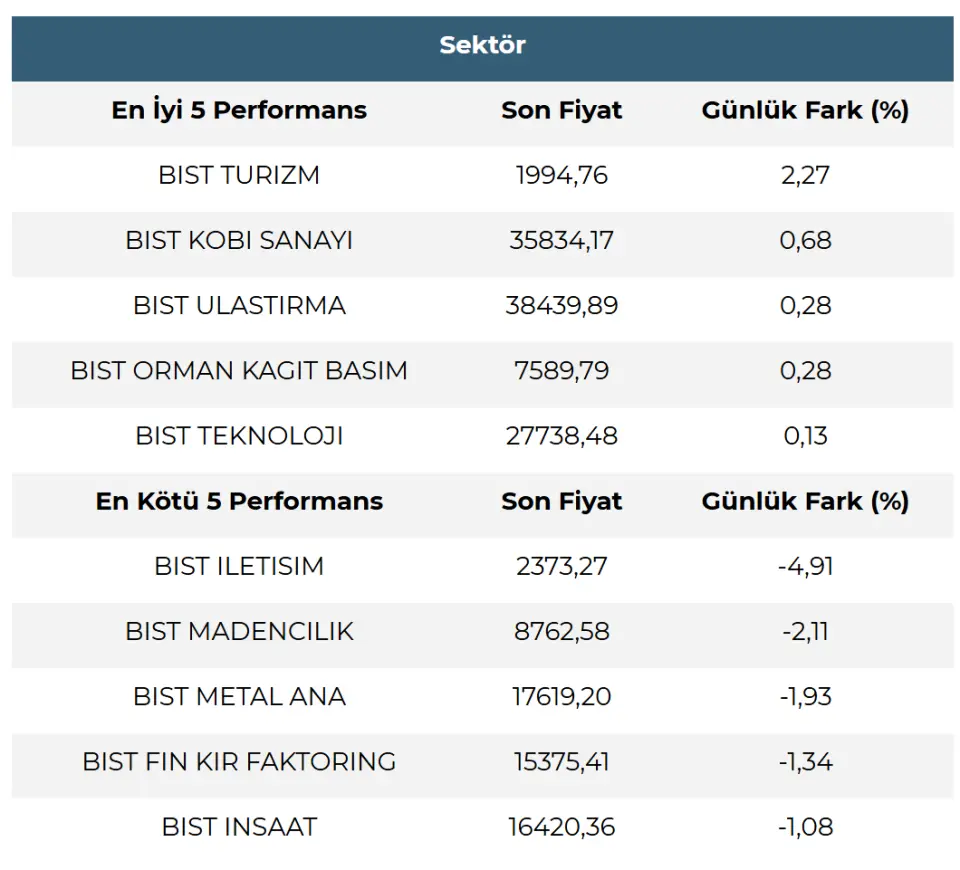 Sektör görünümlerinde ilk yarıda genel olarak negatif seyrin hakim olduğu görülmektedir. En iyi performans sergileyen(ler) Turizm, Kobi Sanayi ve Ulaştırma iken baskı görenlerde İletişim, Madencilik ve Metal Ana dikkat çekmektedir.