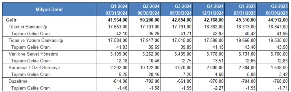 2025 yılı ikinci çeyreklik dönemde, JP Morgan’ın toplam geliri %10,6 oranında gerilemeyle 44 milyar 979 milyon Dolar tutarında gerçekleşti. Banka’nn net faiz geliri 23,2 milyar Dolara yıllık %2 oranında büyümeyle kaydedildi. JP Morgan’ın faaliyet karı yıllık %22,5 oranında düşüşle, 18,4 milyar Dolar tutarında karşımıza çıktı. Net kar da %22,4 oranında düşerek, 14 milyar Dolar ile karşımıza çıktı.