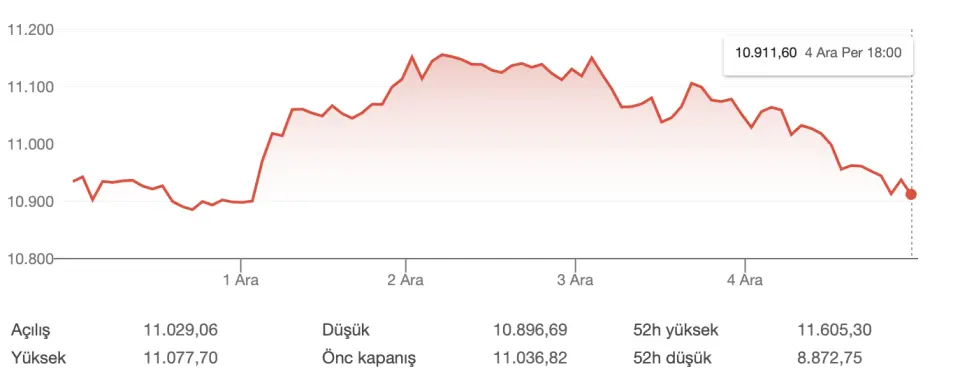 - "Ayın en önemli makro verisinin geride kalmasıyla yıl sonunda bir ralli yaşanma ihtimali düşük görünüyor. Ancak 11 Aralık’taki PPK toplantısı öncesinde TCMB’den faiz indirimi beklentilerinin korunduğunu düşünürsek yukarı yönlü hareket alanının tamamen ortadan kalktığını söylemek güç. Teknik açıdan bakıldığında ise hafta içinde 11.200 puanı gören BIST-100 endeksinin bu bölgede tutunamamasının ardından 11.000 puanın da altında kapanış yapmasının kısa vadeli görünümü bulanıklaştırdığını düşünüyoruz. Baskının devam etmesi durumunda bugün 10.850 puanı ilk destek olarak izleyeceğiz."