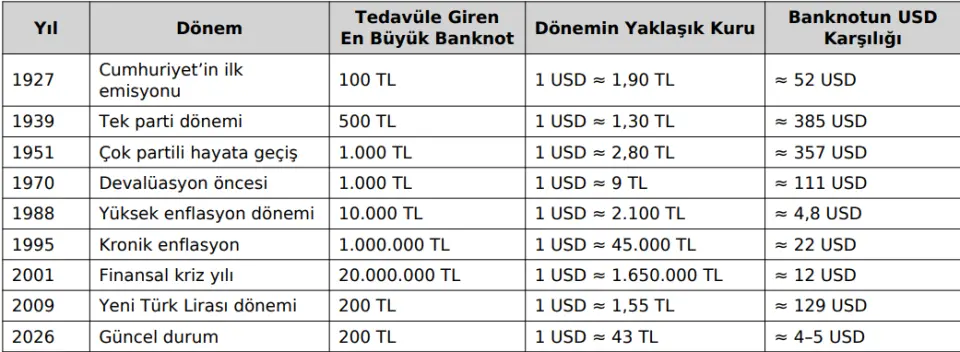 Türkiye’de En Büyük Banknotun Dolar Karşılığı: Cumhuriyet’ten 2026’ya Tarihsel Analiz