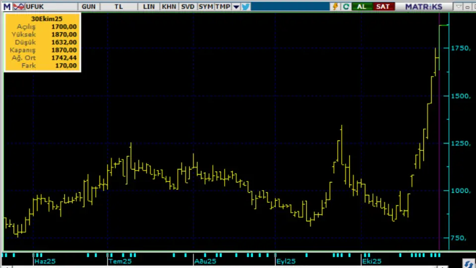 Sermaye Piyasası Kurulu kararı uyarınca devreye alınan Volatilite Bazlı Tedbir Sistemi (VBTS) kapsamında UFUK.E payları 31/10/2025 tarihli işlemlerden (seans başından) 29/11/2025 tarihli işlemlere (seans sonuna) kadar emir paketi tedbiri ile işlem görecektir. Emir paketi tedbiri, "piyasa emri ve piyasadan limite emir girişinin kısıtlanması", "emir iptalinin, emir miktar azaltımı ile emir fiyat kötüleştirmesinin yasaklanması" ve "emir toplama bilgi yayınının kısıtlanması" uygulamalarını kapsamaktadır. İlgili payda halihazırda uygulanmakta olan ve VBTS kapsamında önceki aşamalarda tanımlanan tedbirler de (açığa satış ve kredili işlem yasağı ile brüt takas tedbirleri) emir paketi tedbirlerinin uygulandığı süre boyunca devam edecektir.