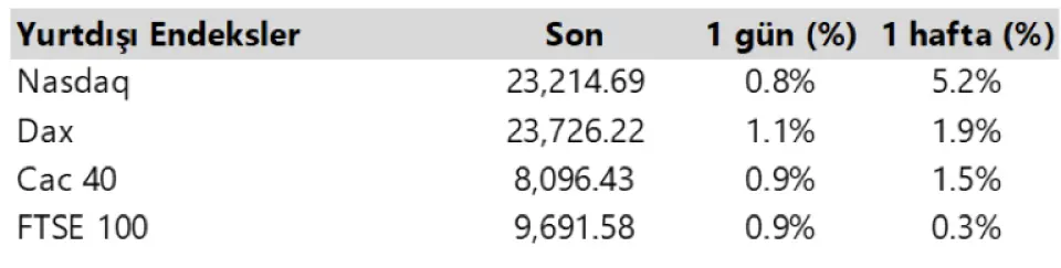 Avrupa borsaları da haftanın üçüncü işlem gününde pozitif bir seyirle kapattı. Kapanışta gösterge endeks Stoxx Europe 600, %0,02 düşerek 561,71 puan oldu. İtalya'da FTSE MIB 30 endeksi %1,01 kazançla 43.130,32, Fransa'da CAC 40 endeksi %0,88 artışla 8.096,43 ve İngiltere'de FTSE 100 endeksi %0,85 kazançla 9.691,58 puandan kapandı. Almanya'da DAX 40 endeksi %1,11 değer kazanarak 23.726,22 puana çıktı. Bu sabah Avrupa vadelileri pozitif seyrediyor.