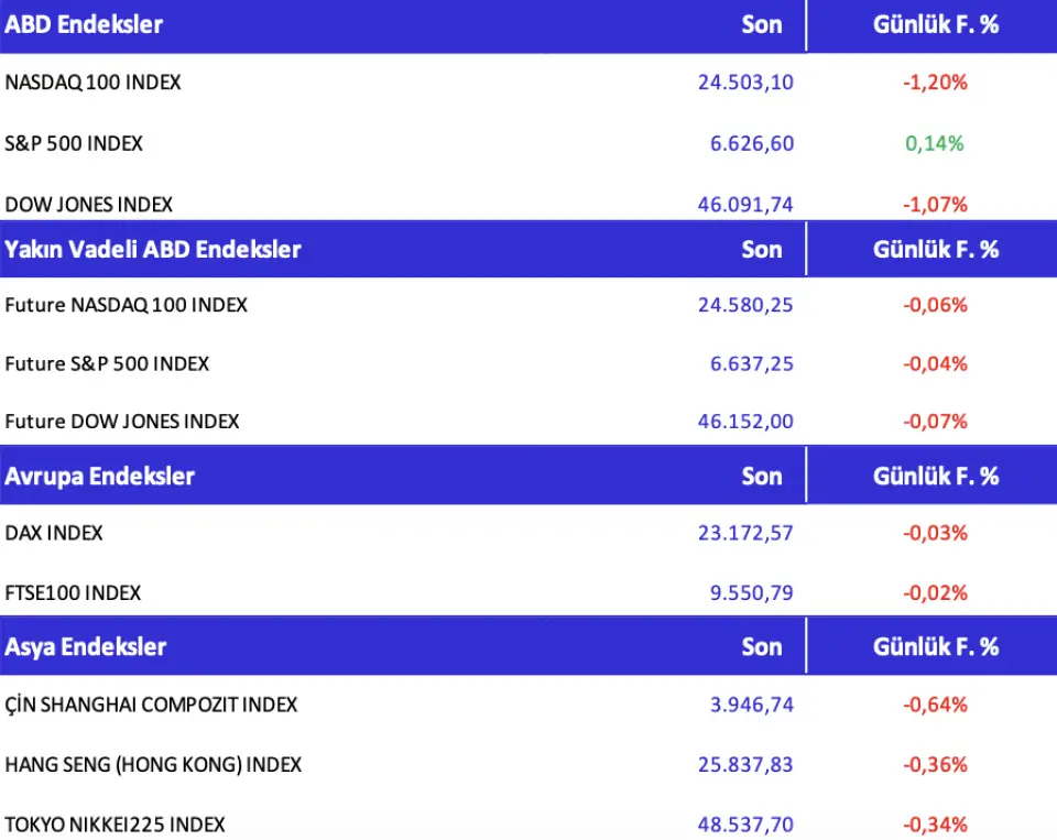 Nvidia, Peter Thiel’in fonunun tüm hisselerini satmasının ardından %0,9 değer kaybederken, üçüncü çeyrek bilançosu öncesi baskı altında. Home Depot, beklentilerin altında kalan üçüncü çeyrek karı ve düşen satış tahminiyle %3,3 geriledi. Honeywell, BofA tarafından düşüşe alınırken, Dell %8,4 kayıpla S&P 500’de en kötü performansı gösterdi. PDD Holdings’in gelir artışı yavaşlarken, Medtronic ikinci çeyrek kazanç ve gelir beklentilerini aşarak %5,4 yükseldi. Baidu ve Alphabet ise güçlü çeyrek sonuçları ve yeni yatırım haberleriyle sınırlı da olsa yükseliş kaydetti.