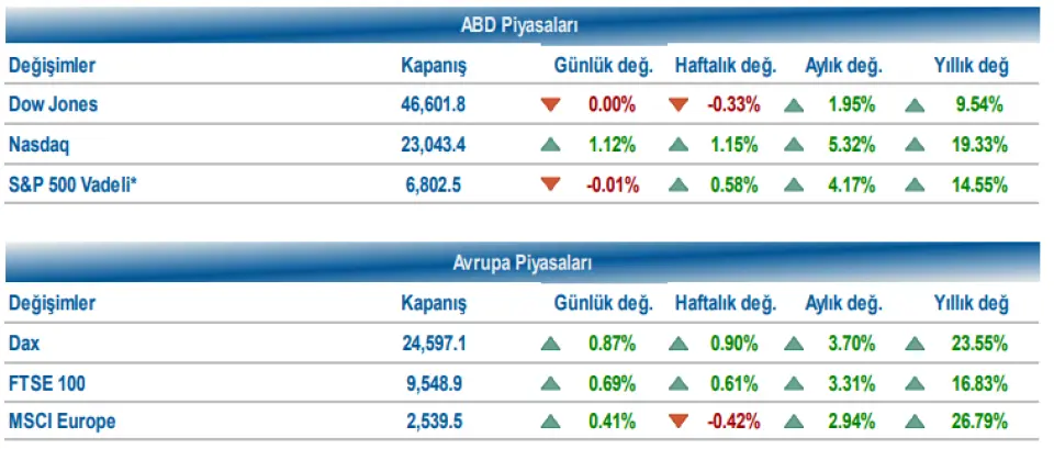Nasdaq endeksi %1,12 artışla 23.043,38, S&P 500 endeksi %0,58 yükselişle 6.753,72 seviyesinden günü tamamlarken, Dow Jones endeksi ise yatay bir seyir izleyerek 46.601,78 puandan günü tamamladı.