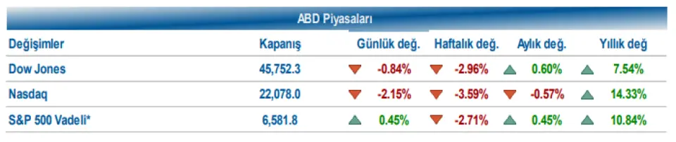 Bu gelişmelerin etkisinde, ABD endekslerinde satıcılı seyir izlendi. Dow Jones endeksi %0,84 azalışla 45.752,26, S&P 500 endeksi %1,56 azalışla 6.538,76, Nasdaq endeksi %2,15 düşüşle 22.078,05 puandan günü tamamladı. ABD’de tahvil faizleri cephesinde 2 yıllık tahvil faizi %3,55 seviyesine, 10 yıllık tahvil faizi de %4,10 seviyesine geriledi.