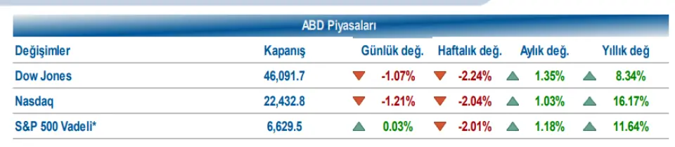 Tüm bu gelişmelerin etkisinde, ABD endekslerinde satıcılı seyir izlendi. Dow Jones endeksi %1,07 kayıpla 46.091,68, S&P 500 endeksi %0,82 kayıpla 6.617,37, Nasdaq endeksi %1,21 düşüşle 22.432,85 puandan günü tamamladı.