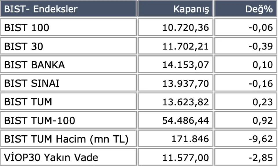 BIST30 Endeksi %0,39 puan düşerek 11.702 puandan seansı tamamladı. BIST Banka Endeksi %0,10 artarken BIST Sınai Endeksi %0,16 geriledi.