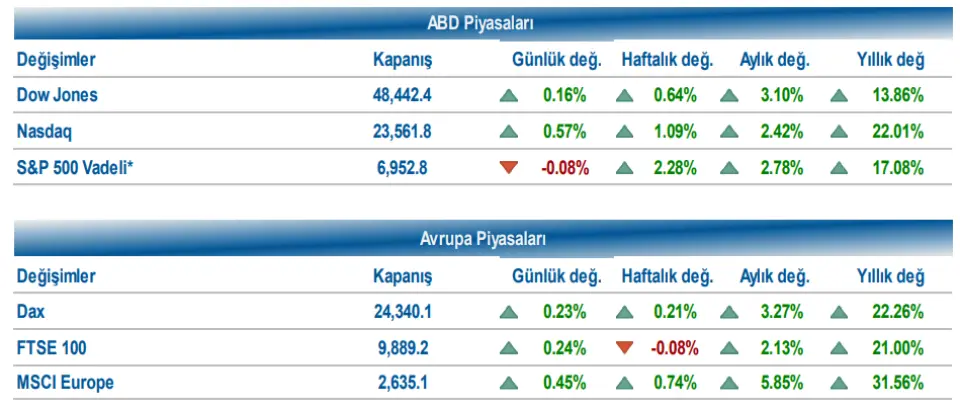 Bu gelişmelerin etkisiyle Dow Jones endeksi %0,16 artışla 48.442,41, S&P 500 endeksi %0,46 yükselişle 6.909,79, Nasdaq endeksi %0,57 artışla 23.561,84 seviyesinden günü tamamladı. Tahvil faizleri cephesinde 2 yıllık tahvil faizi %3,53 seviyesine hafif yükselirken, 10 yıllık tahvil faizi %4,16 seviyesinde yatay seyretti. VIX endeksi ise 14,08’den 14,00 seviyesine geriledi.