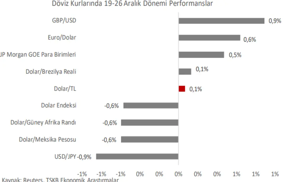 Küresel riskli varlıklara olan talep bu hafta genelinde pozitif bir seyir izledi. MSCI gelişmekte olan ekonomiler hisse senedi endeksi 25 Aralık itibarıyla önceki hafta kapanışının %1,7 üzerindeyken, MSCI dünya geneli hisse senedi endeksinde de %1,4 artış gerçekleşti. Bu hafta
