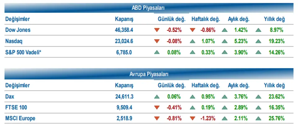 Nasdaq endeksi %0,08 azalışla 23.024,63, S&P 500 endeksi %0,28 düşüşle 6.735,11, Dow Jones endeksi %0,52 azalışla 46.358,42 puandan günü tamamladı.