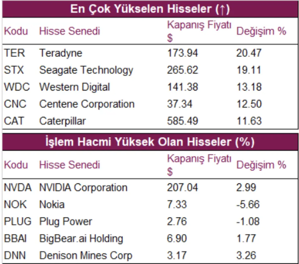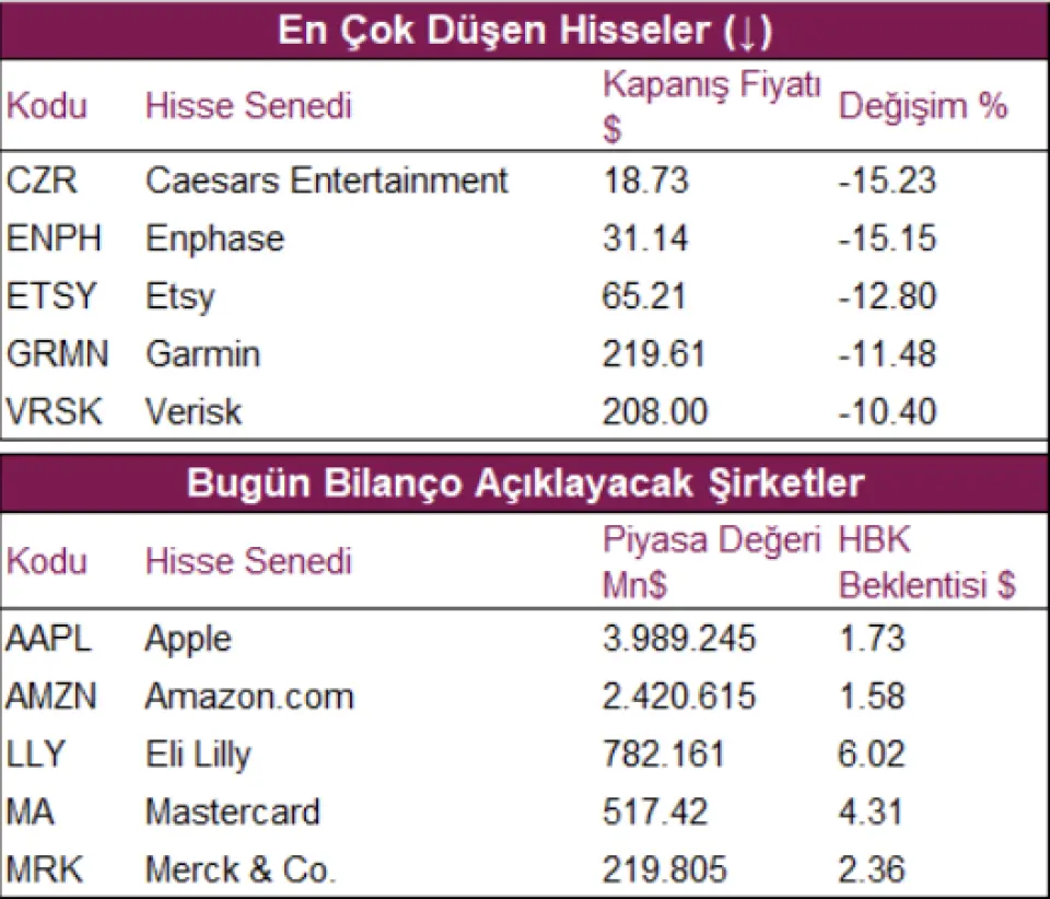 Nasdaq %0,55 değer kazanırken S&P 500 yatay, Dow Jones %0,16 değer kaybetti. Teknoloji %1,05, telekomünikasyon %1,04, enerji %0,80, endüstriyeller %0,25 değer kazanımıyla pozitif performanslar gösterirken, gayrimenkul %2,66, zaruri tüketim %2,00, ham madde ve finans %1,75 değer kaybetti. Ekonomik veri akışında küresel piyasalarda Avrupa ve ABD büyüme verileri takip ediliyor olacak. Asya endeksleri yatay negatif fiyatlanırken, Avrupa endeksleri yatay pozitif işlem görmekte.