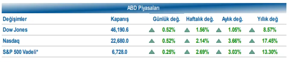 Haftalık bazda ise son dönemdeki dalgalanmalara rağmen, endeksler haftayı artıda tamamladı. S&P 500 üçüncü çeyrek bilanço sezonunun güçlü başlamasının desteğinde haftalık bazda %1,7 artış kaydetti. Dow Jones endeksi %1,6 değer kazanırken, teknoloji ağırlıklı Nasdaq endeksi %2,1 yükselerek haftanın en güçlü performansını gösteren endeksi oldu.