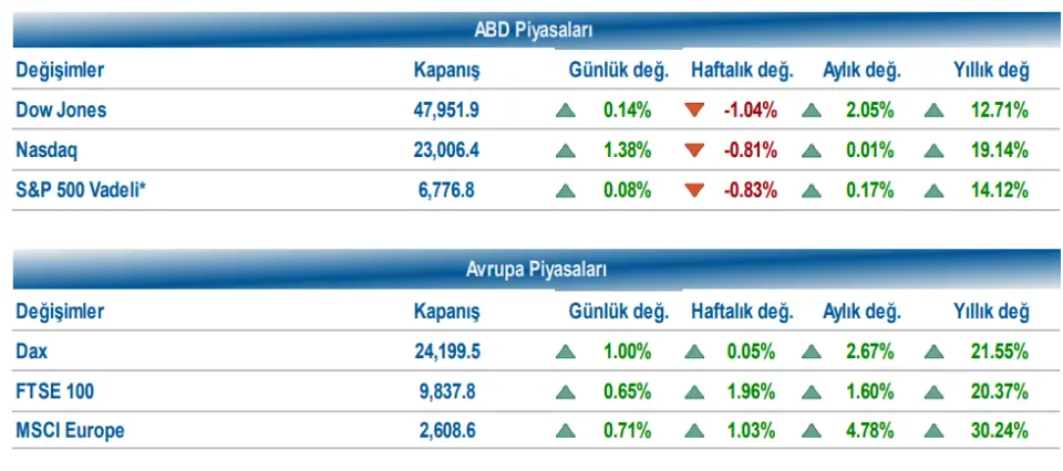 Dow Jones endeksi %0,14 puan artışla 47.951,85, S&P 500 endeksi %0,79 puan yükselişle 6.774,76, Nasdaq endeksi %1,38 puan artışla 23.006,36 seviyesinden günü tamamladı.