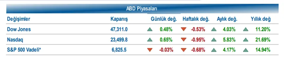 Bu gelişmelerle ABD endekslerinde alıcılı seyir izlendi. Dow Jones endeksi %0,48 kazançla 47.311,00, S&P 500 endeksi %0,37 yükselişle 6.796,29 ve Nasdaq endeksi %0,65 artışla 23.499,80 puandan günü tamamladı. ABD’de tahvil faizleri cephesinde 2 yıllık tahvil faizi %3,63,10 yıllık tahvil faizi ise %4,16 seviyesine yükseldi. Öte yandan, VIX endeksi ise 19,00’dan 18,01 seviyesine geriledi. Avrupa piyasalarında alıcılı seyir izlendi. DAX %0,42, Euro Stoxx %0,20, CAC 40 %0,08, FTSE 100 endeksi %0,64 oranında değer kazandı.
