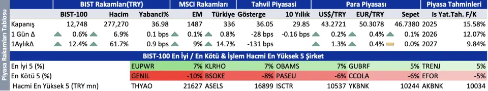 Dünya borsalarının seyri Borsa İstanbul'da satıcılı bir açılışa işaret ediyor. Ama küresel yükselişe katılmadığımız için satıştan da fazla etkilenmeyiz. Para Politikası Kurulu kararı öncesi gösterge tahvil ve bankalarda alış devam edebilir. Gösterge tahvil faizinin Ekim 2023 sonrası ilk kez %36.0'nın altına gerilemesi Borsa İstanbul'da yükselişi destekliyor. Endeks için destek ve direnç seviyeleri 12.700 ve 12.850.