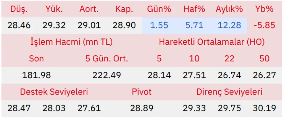 Gün içinde en düşük 28.46 en yüksek 29.32 seviyesini gören AG Anadolu Grubu Holding hissesinin günü %1.55 kazançla tamamladığı gözlenmektedir. Pivot seviye 28.89 seviyesinden geçmekte olup, aşağı yönlü hareketlerde birinci destek 28.47, ikinci destek ise 28.03 seviyesinden geçmektedir. Dirençler ise sırasıyla 29.33, 29.75 seviyelerinden geçmektedir. Bu aşamada endeksin 5 günlük HO seviyesinin %2.70 üstünde, 22 günlük HO seviyesinin ise %8.07 üstünde hareket ettiği dikkat çekmektedir. Son gün işlem hacmi ise bu aşamada 5 günlük ortalama işlem hacminin % 18.21 altında gerçekleşmiştir.