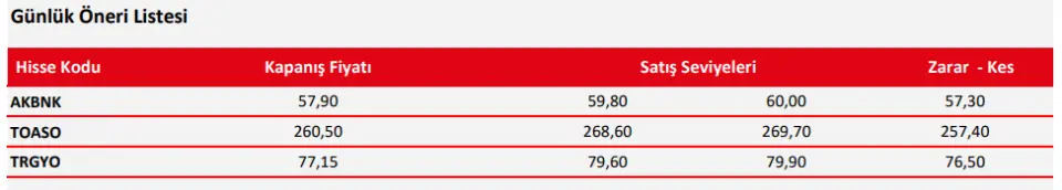 AKBNK, TOASO ve TRGYO İçin Günlük Hedef Fiyat Verildi