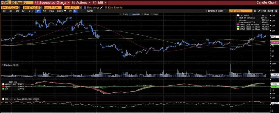 Marvell Technology INC., (MRVL) 16 Ekim 2025 gününü 88,23 seviyesinden kapattı. Güncel olarak 50, 100 ve 200 günlük üssel hareketli ortalamaların üzerinde işlem görüyor.