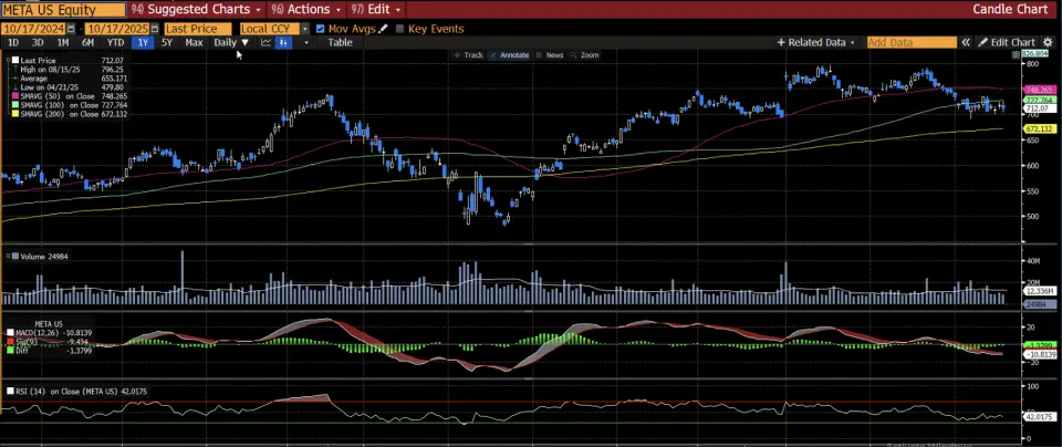 Meta Platforms Inc., (META) 16 Ekim 2025 gününü 712,07 seviyesinden kapattı. Güncel olarak 50 ve 100 günlük üssel hareketli ortalamaların altında, 200 günlük üssel hareketli ortalamanın üzerinde işlem görüyor.