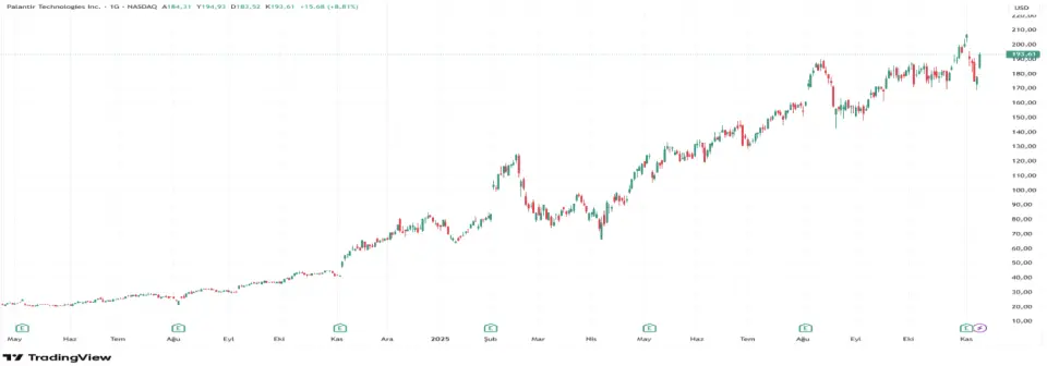 10 Kasım 2025’te Palantir Technologies Inc. (PLTR) hissesi 193,61 $ seviyesinden kapanarak, bir önceki kapanışa göre yaklaşık %8,8 artış gösterdi. Bu yükselişte, yapay zekâ odaklı beklentiler ve Washington’daki hükümet kapanışının sona erdirilmesine yönelik gelişmeler, Palantir’i Wall Street’te öne çıkan hisseler arasına taşıdı.