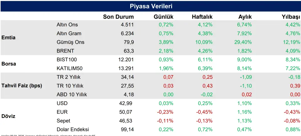 Geçtiğimiz hafta ons altın %4,12 yükselişle 4.511 dolar, gram altın ise %4,38 artışla 6.234 TL seviyesinden kapanış yaptı. Bu yükselişte, Fedyetkililerinin güvercin tondaki açıklamalarıyla pekişen faiz indirimi beklentileri ve Venezuela eksenli jeopolitik gerilimlerin tetiklediği güvenli liman