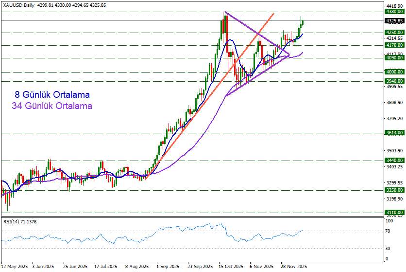 Ons altın geçtiğimiz hafta FED’in faiz indirimi kararı ile yukarı yönlü tepkiler almaya başlamıştı. Yükselişler haftanın son işlem gününde 4353 seviyesine kadar etkili oldu. Haftalık kapanışın 4300 seviyesinde gerçekleşmesinin ardından ons altın yeni haftaya pozitif giriş yaptı. Asya seansındaki yükselişler 4330 seviyesini gündeme getirdi.