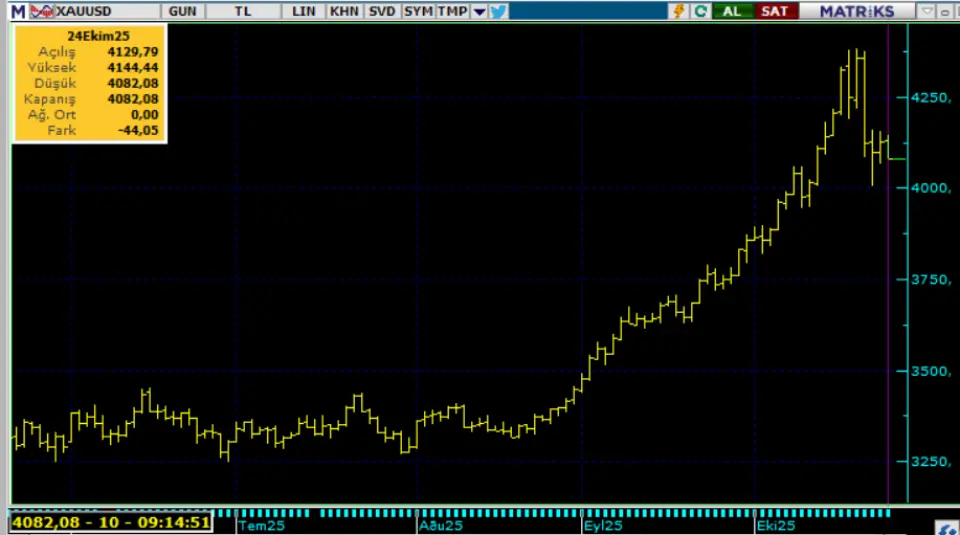Altın fiyatlarında teknik olarak psikolojik destek noktası 4.000 Usd destek noktası olarak takip edilebilir. Bu sabah 4.113 Usd seviyesindeki ons altında 4.133 ve 4.200 Usd seviyeleri gün içi direnç, 4.100 ve 4.000 Usd seviyeleri gün içi destek seviyeleri olarak izlenebilir. Bugün sınırlı negatif seyir izleyebilir.