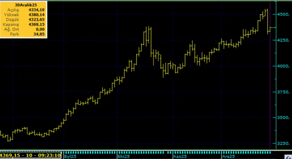 Teknik tarafta tüm zamanların en yüksek seviyesini test eden altın güne tepki yükselişi ile başlıyor. 4.385 Usd üstünde kalıcılık satış baskısının azalmasına neden olabilir. Altında fiyatlama da yeni denge arayışı devam edebilir. Bu sabah 4.366 Usd seviyesindeki ons altında 4.400 ve 4.425Usd seviyeleri gün içi direnç, 4.300 ve 4,250 Usd seviyeleri gün içi destek seviyeleri olarak izlenebilir. Bugün sınırlı negatif seyir izleyebilir.