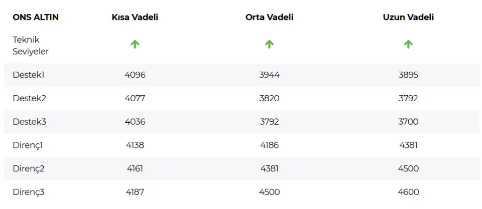 Ons altında fiyatlar geri çekilme bölgesinin üzerinde tutunarak kısa vadeli pozitif görünümü güçlendirdi. Envelopes (35) göstergesi ve 4010–4036 bandı üzerinde yapılan 4 saatlik mum kapanışları bu görünümü destekliyor. Ana senaryoda, daha önce birçok kez test edilen ancak aşılamayan 4131–4161 bandı kritik eşik konumunda. Bu bölgenin üzerinde kalıcılık sağlanması durumunda, ons altında yukarı yönlü ivmenin güçlenmesi ve yeni rekor seviyelerin gündeme gelmesi sürpriz olmayacaktır. Olası geri çekilmelerde ilk olarak 4077, sonrasında ise 4010–4036 aralığı izlenebilir. Diğer senaryoda, bu bölgenin altına sarkılması durumunda düzeltme 3970 seviyesine doğru derinleşebilir.