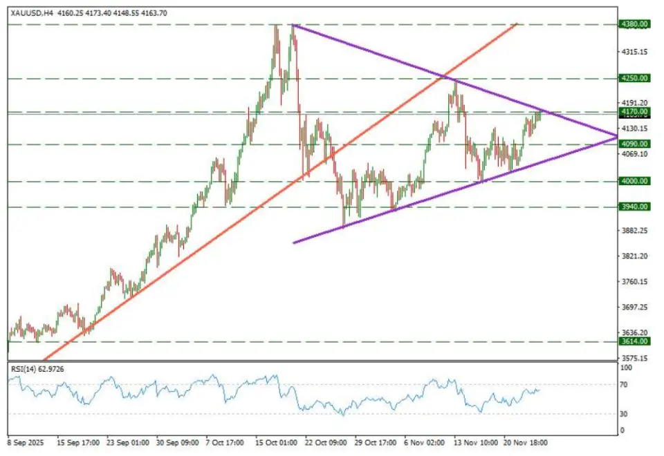 4 saatlik mumlarla incelediğimiz ons altın 4380 rekorundan sonra oluşan iniş çıkışlarla üçgen formasyonu oluşturdu. Son günlerde FED’in faiz indirimi beklentilerinin artması ons altında yukarı yönlü hareketleri beraberinde getirdi. Fiyatlamalar şu sıralar üçgen formasyonun üst bandını be 4170 direncini test ediyor.