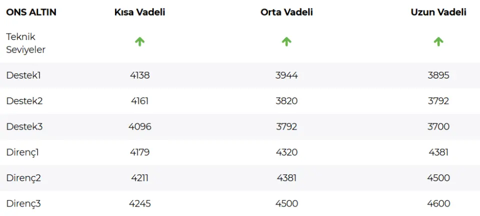 Ons altında kritik eşik olarak görülen ve uzun süredir güçlü bir bariyer işlevi gören 4138–4161 bandının aşılması, fiyatı yeni zirve arayışına taşıdı. Ana senaryoda, bu bölgenin üzerinde kalındığı sürece pozitif eğilimin korunması beklenebilir. Yukarıda 4275 ve 4320 seviyeleri izlenebilir. Geri çekilmelerde ise 4138–4161 bölgesinin vereceği tepkiler takip edilecek. Bu bölgenin altına sarkılması halinde ise düzeltme hareketinin 4096 seviyesine doğru derinleşme ihtimali gündeme gelebilir.