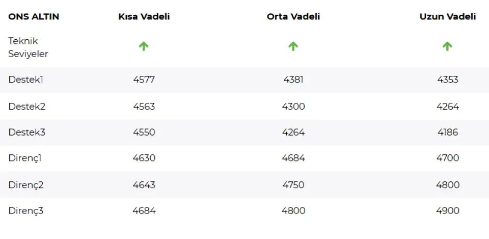 4643 ile yeni rekor yaptıktan sonra yatay bir bantta hareket eden ons altın, 35 periyotluk üstel Envelopes ve 4563- 4577 bölgesi üzerinde kaldığı sürece pozitif görünümünü koruyor. Ana senaryoda yukarı yönlü eğilimin sürmesini bekliyoruz. İlk etapta rekor seviye 4643, ardından 4684-4700 bölgesi takip ediliyor. Alternatif senaryoda 4563- 4577 bölgesinin kırıldığı durumda eski zirve 4550 ve kırılımı ile yükseliş ivmesini artıran 4500 seviyeleri izleniyor olacak.