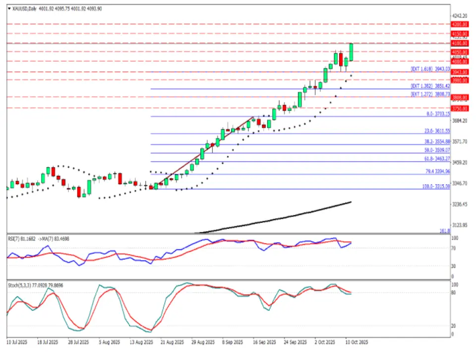 Teknik açıdan bakıldığında, yükseliş trendi güçlü şekilde korunuyor. Fiyat 4000 dolar desteği üzerinde tutunmayı sürdürürken, 4050 direnç seviyesini güçlü geçerek 4100 direncini test etmeye başladı ve yukarıda 4.100 ve 4.150 dolar direnç seviyeleri kısa vadede hedef olarak öne çıkıyor. RSI göstergesi 81 seviyesinde aşırı alım bölgesinde seyrederken, Stokastik osilatör de bu görünümü teyit ediyor. Kısa vadede aşırı alım koşulları nedeniyle sınırlı geri çekilmeler yaşanabilir; ancak 4000 doların üzerinde kalındığı sürece yükseliş eğilimi korunacaktır.