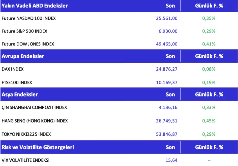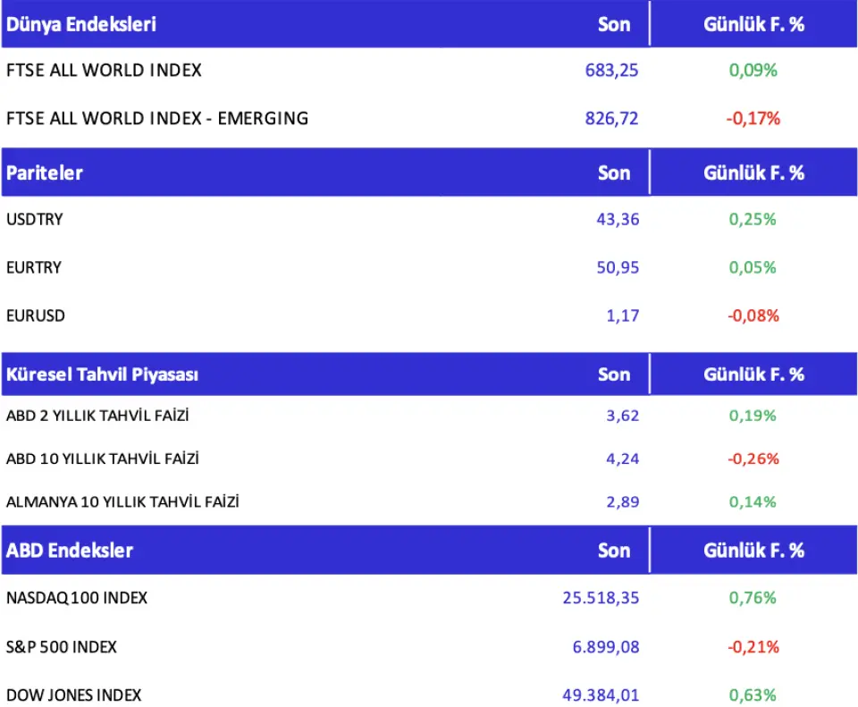 ABD Verileri ve Teknoloji Rallisi Piyasalara Destek VerdiABD'de büyüme verilerinin yukarı yönlü revize edilmesi, teknoloji hisselerindeki ralli ve jeopolitik tansiyonun düşmesi perşembe günü küresel piyasalara alım getirdi. Üçüncü çeyrek GSYH artışı yüzde 4,4'e revize edilirken, tüketici harcamalarındaki güçlü seyir Fed'in faizleri sabit tutabileceği beklentisini destekledi. Nvidia CEO'su Jensen Huang'ın yapay zekâ vurguları teknoloji hisselerini öne çıkarırken, S&P 500 yükseldi, "Muhteşem Yedili" güçlü performans sergiledi, Russell 2000 rekor kırdı ve VIX endeksi 16'nın altına geriledi. ABD'de gün içinde PMI ve güven endeksi verileri izlenecek.