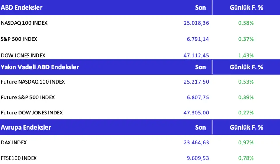 Sektör bazlı hareketlerde sağlık hisseleri %2,2 ile yükselişe liderlik ederken Eli Lilly yeni rekor kırdı. Tüketici tercihi, iletişim hizmetleri, finans, sanayi, temel tüketim ve materyaller de güçlü primlerle endekse destek verdi. Buna karşılık teknoloji tarafı Meta’nın Google’ın yapay zekâ çiplerini kullanmayı değerlendirdiği haberinin ardından Nvidia’da kâr satışlarının hızlanmasıyla negatif ayrıştı. Enerji ve kamu hizmetleri düşerken gayrimenkul sınırlı yükseldi; böylece sekiz sektör artıda kapatmasına rağmen teknoloji sektöründeki baskı görünümü dengeledi.
