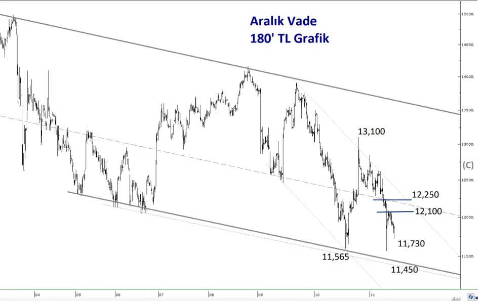 Cuma günü satış baskısının devam ettiği piyasada, Aralık kontratının seans içinde 11,750 bölgesine doğru yaşadığı savrulmayı takiben seansın son bölümlerinde etkili olan tepki alımlarıyla günü %0.53'lük gerilemeyle 11,871 puandan tamamladığını görüyoruz. Genel olarak baktığımızda ise, hafta boyunca zayıf bir seyrin etkili olduğu piyasada X30YVadeli kontratın haftalık bazda %4.03'lük değer kaybı yaşadığını söyleyebiliriz.