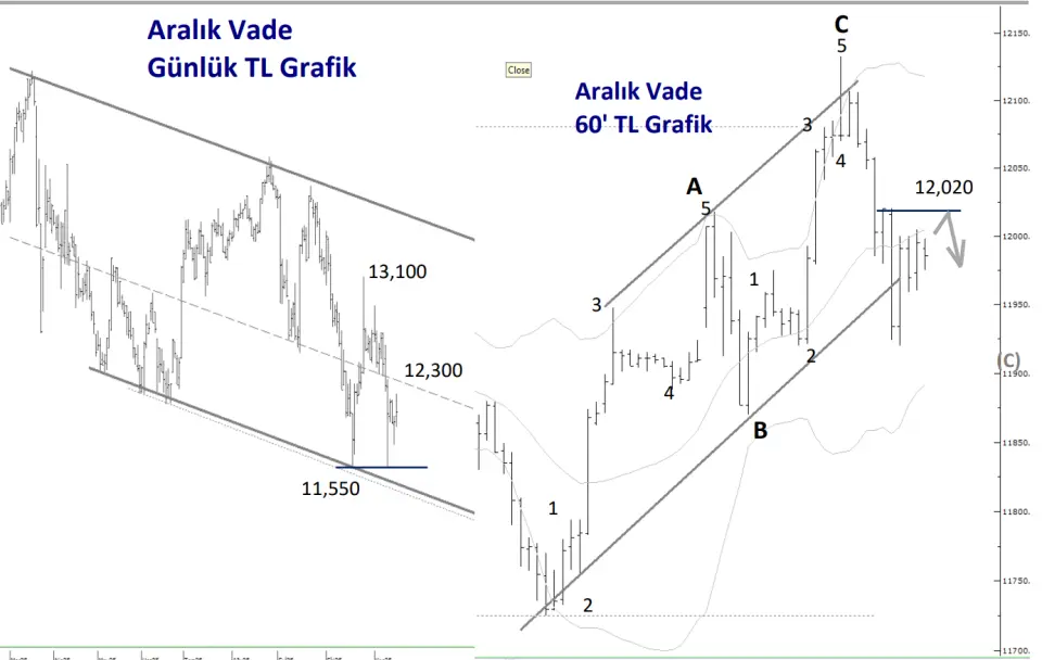 Haftanın ilk günü alıcılı bir seyir izleyen piyasada, Aralık kontratının günü %0.98'lik yükselişle 11,986 puandan tamamladığını görüyoruz. Genel olarak baktığımızda ise, geçen hafta yaşanan %4'lük kaybın ardından haftaya yukarı yönü tepki denemeleriyle başlayan piyasada, ilk önemli direnç olarak izlediğimiz 12,100 bölgesinin aşılamadığını ve tepki çabalarının henüz yeterli güce ulaşamadığını söyleyebiliriz.