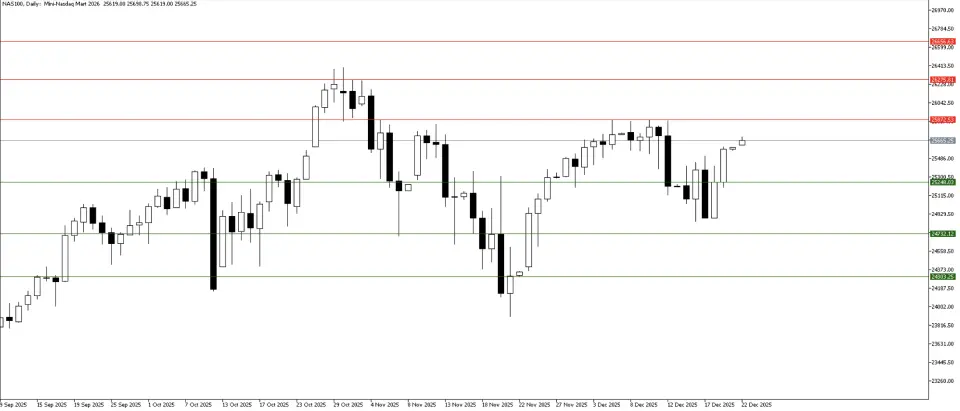 Nasdaq için haftanın ikinci yarısından itibaren düşük volatilite bekleniyor. İlk direnç seviyesinin aşılması, 26275 direnç bölgesinin önemini artırabilir. Destek olarak 25248, 24732 ve 24303 seviyeleri önemli olabilir. Direnç olarak ise 25872, 26275 ve 26656 seviyeleri takip edilebilir.